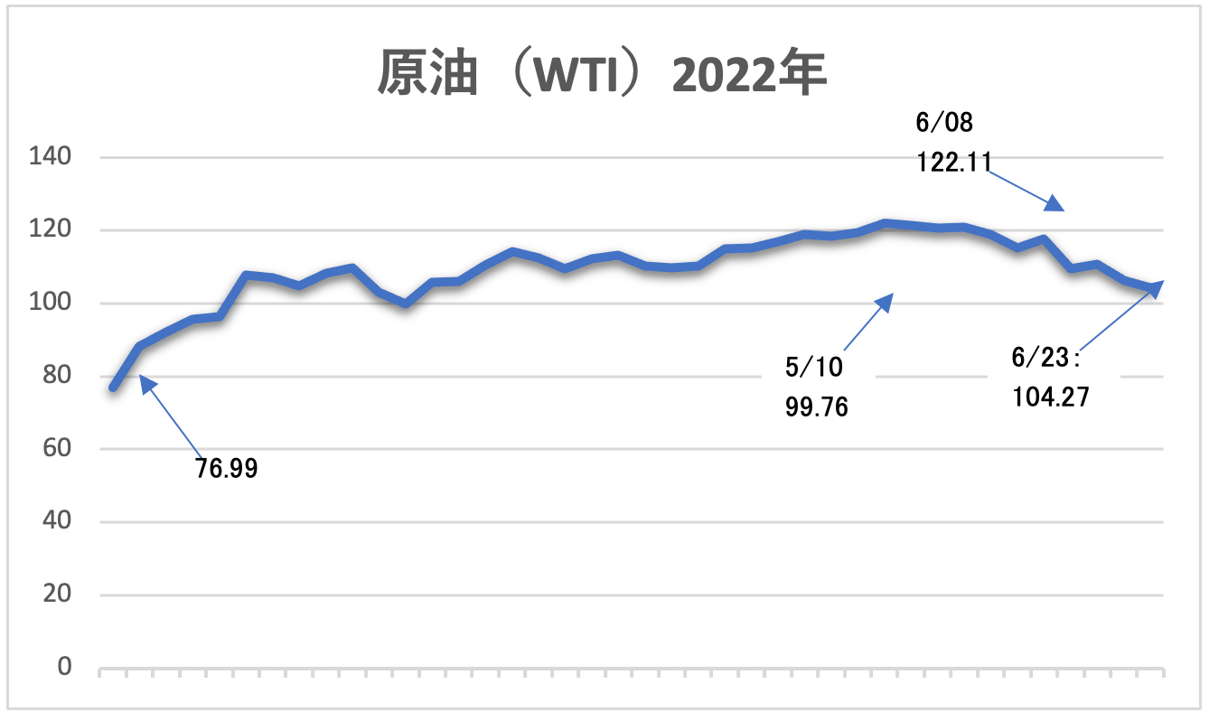 原油価格(WTI)は、1 バレル=110 ドル程度で高止まりし、6 月 8 日には 122 円を記録して